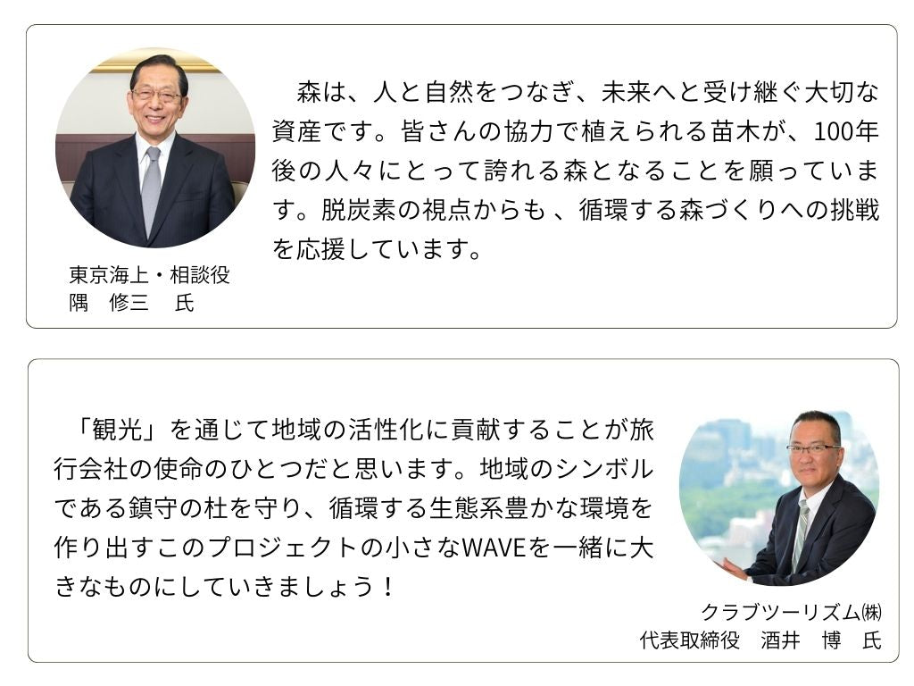 施主と業者で森を作るのではなく、資金面でも、実際の植樹活動の面でも、あえて多くの人に関わってもらい、次世代の未来へ繋ぐ「みんなの森」にしたい。植樹イベントなども検討していく予定です。
