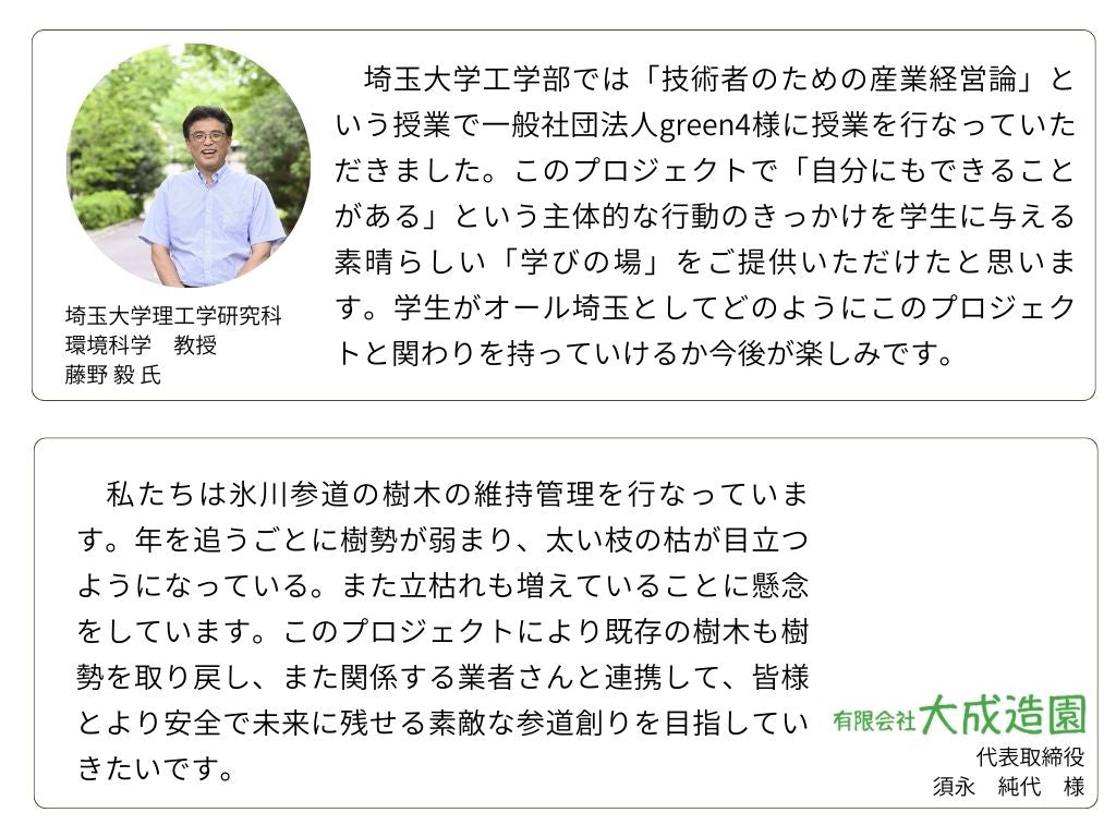 「環境保全」と「教育」をテーマに取り組むgreen4は武蔵一宮氷川神社と連携し、「武蔵一宮氷川神社 鎮守の杜100年プロジェクト」を継続します。環境土木の専門家である高田宏臣氏に調査と改善策を提示していただき、土中環境の改善と苗木の植え付けを行います。ただ追加の植樹をするのではなく、土中環境を整え、生態系豊かな「循環する森づくり」をします。