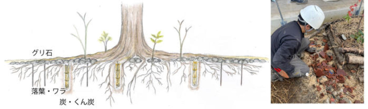 切株の根元の土中には空洞がたくさんあるため、次世代の樹木が発芽がしやすくなっています。そこを狙って縦方向に穴を何箇所も開け、炭・くん炭・落ち葉・グリ石・ワラなどを使い、菌糸が張りやすい環境を作ります。また、密植することで枝を上に伸ばし、土中の根っこを縦方向に深く伸ばしやすくします。