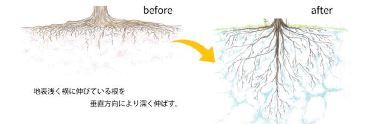 本プロジェクトは、土壌環境の改善を目指し、土中環境の専門家である高田造園設計事務所(高田宏臣氏)の指導のもと、長期的な環境再生を実現することを目指します。