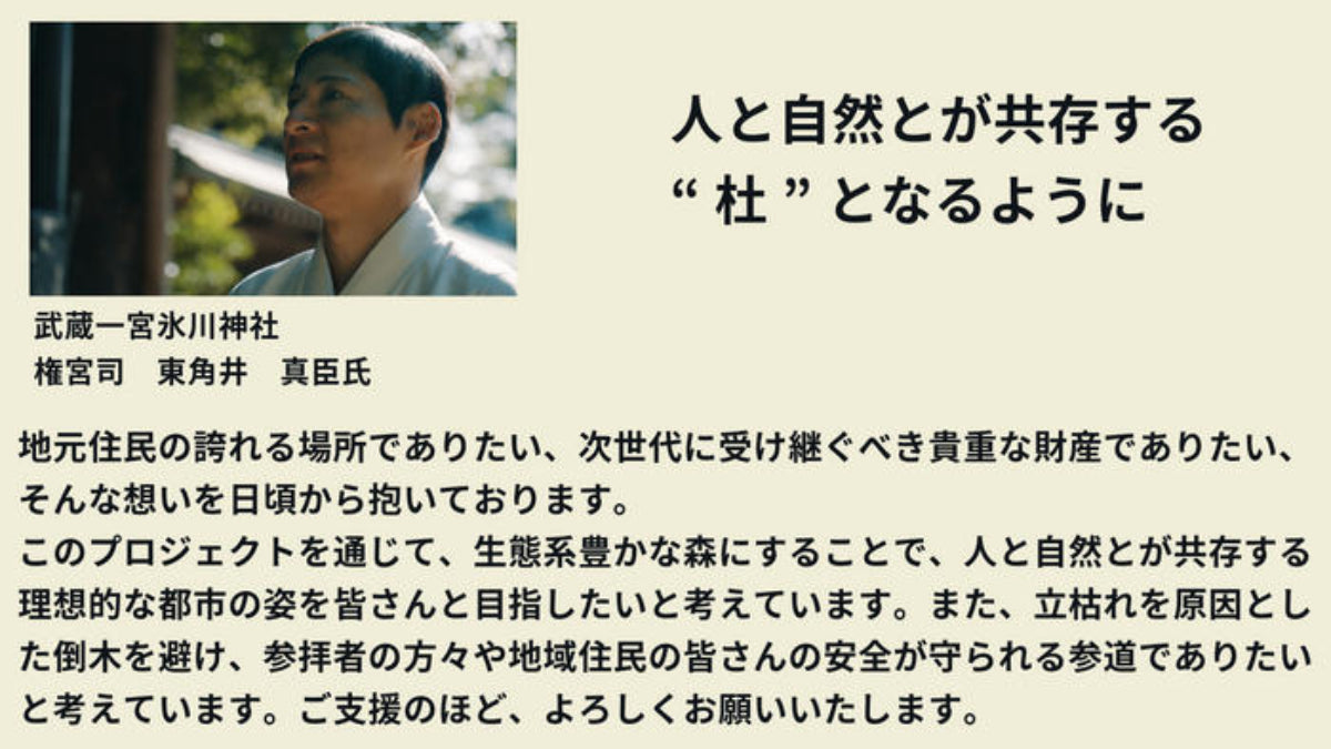 氷川参道は地元住民の誇りであり、次世代に受け継ぐべき貴重な財産です。生態系豊かな森にすることで、人と自然とが共存する理想的な都市の姿を目指します。また立枯れを原因とした倒木を避け、参拝者の方々や地域住民の皆さんの安全が守られる参道でありたいと考えています。